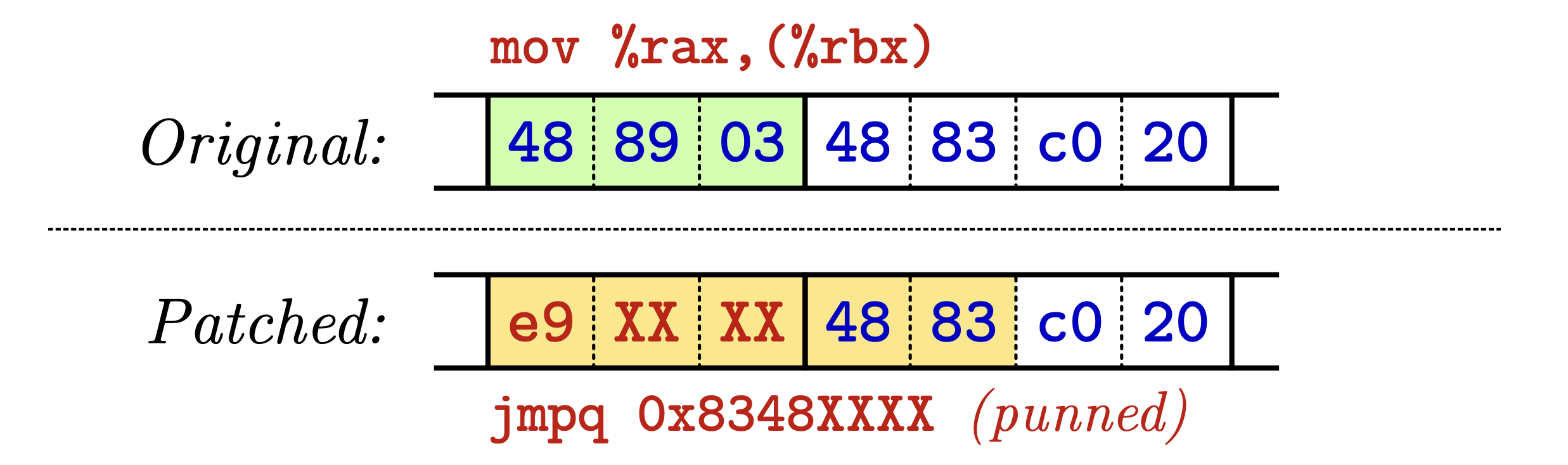Jump-based: The jump-based trampoline replaces the original instruction with a jump to a separate code block. While this is the simplest form, this can not be used to replace all instruction. In x86, for example, such a jump instruction requires at least 5 bytes, which, as the architecture has variable-length instructions, is a problem when trying to overwrite instructions smaller than these 5 bytes. As these overwritten bytes could be the target of another jump, this could lead to a segmentation fault. In order to prevent this, the binary rewriter has to perform a control flow analysis, which introduces more complexity and heuristics.