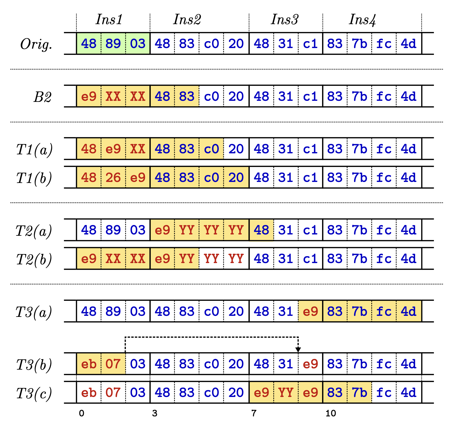Instruction punning: Instruction punning is the same as jump-based, but it increases the instruction coverage of the 5-byte-sized jump problem. For this, it still overwrites the original instruction but keeps the second instruction intact while using it as the MSB of the jump target address, as shown in Figure 1. These punned instructions are therefore used twice, first for the jump target and then interpreted as an instruction. As the second instruction then controls the MSB of the target address, this only works if the binary rewriter can place the instruction there.
